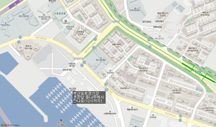 2. 요트경기장 주소 및 찾아오시는길 주소 : 부산 해운대구 우1동 1393번지 찾아오시는길 지역간 대중교통 : 비행기로 오실 때-버스* 307번 → 부산문화여고(90분소요) 기차로 오실 때-버스* 139번,40번,1001번 → 부산문화여고(66분소요): 버스로 오실 때 ○ 노포동 종합버스터미널- 버스* 50번 → 동래전화국 하차 → 100번환승 부산문화여고역 하차(80분소요)- 지하철* 1호선 → 서면역 하차(2호선 환승) → 동백섬역 하차 사상서부시외버스터미널- 버 스* 31번 → 부산문화여고역 하차(95분소요)- 지하철* 2호선 환승 → 동백역 하차 지역내 대중교통. : 버 스 - 38번 → 요트경기장역 하차- 100, 100-1, 115-1, 1001번 → 부산문화여고역 하차: 자가용 이용안내 - 경부고속도로 → 부산톨게이트 → 원동IC → 해운대방면 → 올림픽교차로→ 요트경기장 남해고속도로-부산톨게이트 → 동서고가도로 → 황령산터널 → 해운대방면 → 올림픽교차로 → 요트경기장