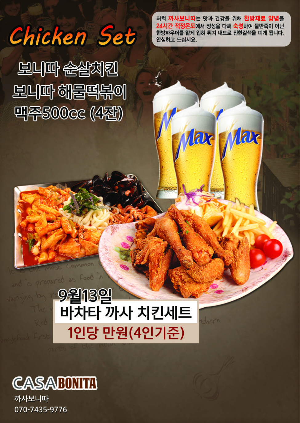 리오신님의 댓글 리오신쪽지보내기 메일보내기 자기소개 아이디로 검색 전체게시물쪽지보내기 메일보내기 자기소개 아이디로 검색 전체게시물 작성일 2014.09.13 03:02 까사보니따에서 9/13 전국 살사&바차타 All Night 파티에 바차타까사 치킨셋트를 만들어 후원해주기로 했습니다.<br>1인당 1만원(4인기준)으로 보니따 순살치킨 + 해물떡볶기 + 생맥주 500cc 4잔 을 드린다고 합니다.<br>물론 치킨(순살, 마늘등등 변경)이나 생맥주를 음료수로 변경 가능합니다.<br> 까사보니따에서 9/13 전국 살사&바차타 All Night 파티에 바차타까사 치킨셋트를 만들어 후원해주기로 했습니다.<br>1인당 1만원(4인기준)으로 보니따 순살치킨 + 해물떡볶기 + 생맥주 500cc 4잔 을 드린다고 합니다.<br>물론 치킨(순살, 마늘등등 변경)이나 생맥주를 음료수로 변경 가능합니다.<br>