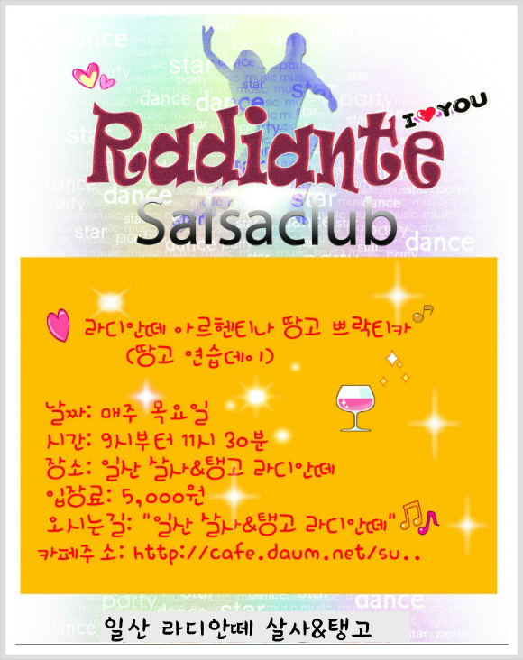 날짜: 매주 목요일 시간: 9시부터 11시30분 장소: 일산 살사&탱고 라디안떼 입장료: 5,000원