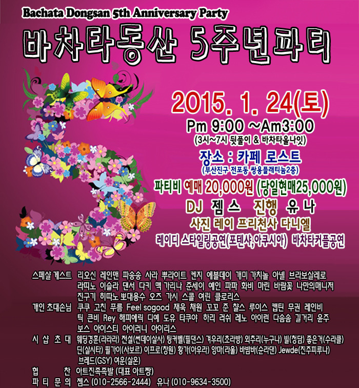 전국 분류 [1월 24일] 바차타동산 5주년 빅파티 coming soon 작성자 정보 Youna(바차타동산)쪽지보내기 메일보내기 자기소개 아이디로 검색 전체게시물쪽지보내기 메일보내기 자기소개 아이디로 검색 전체게시물 작성 작성일 2015.01.08 13:19 컨텐츠 정보 2,318 조회 0 추천 목록 답글 본문 로스트커피에서 전국에서 멋진 춤꾼둘과 재미난 파티 바동만의 색깔을 느껴 보시길~♡ 0 추천 관련자료 링크 http://cafe.daum.net/_c21_/bbs_read?grpid=19pwa&mgrpid=&fldid=J4uU&content=P&contentval=000Xkzzzzzzzzzzzzzzzzzzzzzzzzz&page=1&prev_page=0&firstbbsdepth=&lastbbsdepth=zzzzzzzzzzzzzzzzzzzzzzzzzzzzzz&listnum=20 226 회 연결 이전 아끼퍼커션 아카데미 스튜디오 오픈식에 초대합니다. 작성일 2015.01.08 16:37 다음 강남 맘보 목요쇼셜 "Salsa Dura y Guaguanco" [DJ FREEMAN] 작성일 2015.01.08 13:06 댓글 0 등록된 댓글이 없습니다. 로그인한 회원만 댓글 등록이 가능합니다. 목록 답글