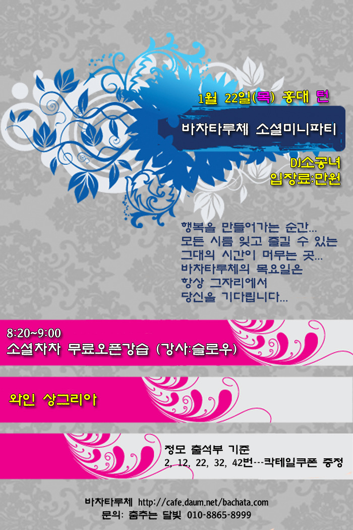 서울 분류 [바차타루체 소셜미니파티] - 2015. 1. 22 (목)/홍대 턴/DJ소공녀/입장료:만원/8:20~9:00 소셜차차 무료오픈강습(강사:슬로우)/와인상그리아 제공 작성자 정보 춤추는 달빛(서울/바차타루체…쪽지보내기 메일보내기 자기소개 아이디로 검색 전체게시물쪽지보내기 메일보내기 자기소개 아이디로 검색 전체게시물 작성 작성일 2015.01.21 11:38 컨텐츠 정보 1,958 조회 0 추천 목록 답글 본문 0 추천 관련자료 링크 http://cafe.daum.net/_c21_/bbs_read?grpid=19pwa&mgrpid=&fldid=J4uN&content=P&contentval=000ifzzzzzzzzzzzzzzzzzzzzzzzzz&page=1&prev_page=0&firstbbsdepth=&lastbbsdepth=zzzzzzzzzzzzzzzzzzzzzzzzzzzzzz&listnum=20 106 회 연결 이전 <3월 21일> 15년 3월 21일 토요일!! 살사홀릭 스프링 소셜 파티!!! 작성일 2015.01.21 10:49 다음 [이태원불독] 토요일 레이디스 데이(입장료 무료) * DJ MAX* 작성일 2015.01.21 11:24 댓글 0 등록된 댓글이 없습니다. 로그인한 회원만 댓글 등록이 가능합니다. 목록 답글