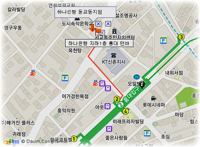 지하철 홍대입구역 2번출구로 나오신후 -> KT신촌지사건불 뒷편 하나은행건물 지하1 층 입니다.