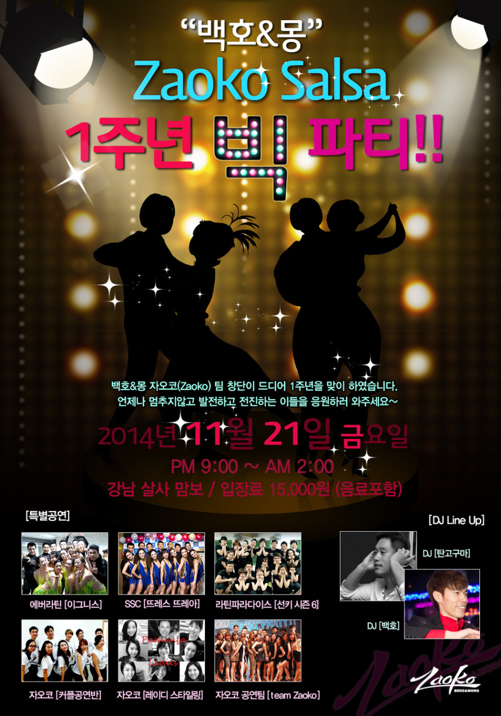 백호&몽 자오코(Zaoko) 팀 창단 1주년 기념 빅!빅!빅! 파티 안내[2014년 11월 21일 금요일 Pm9:00~Am2:00][강남 맘보 살사 클럽]