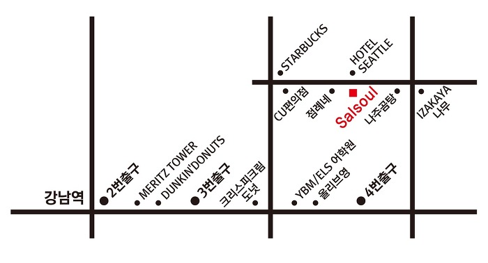 장소(VENUE): Salsoul Dance School (강남역 3번 & 4번출구에서 1분거리 아래 약도를 참조하세요)
