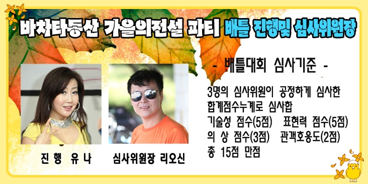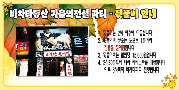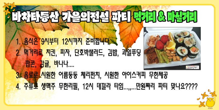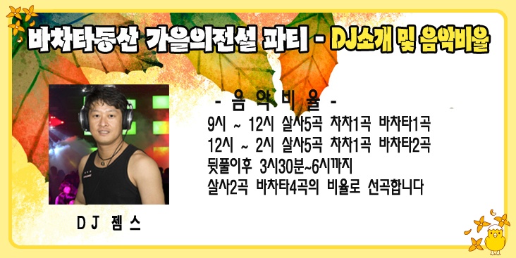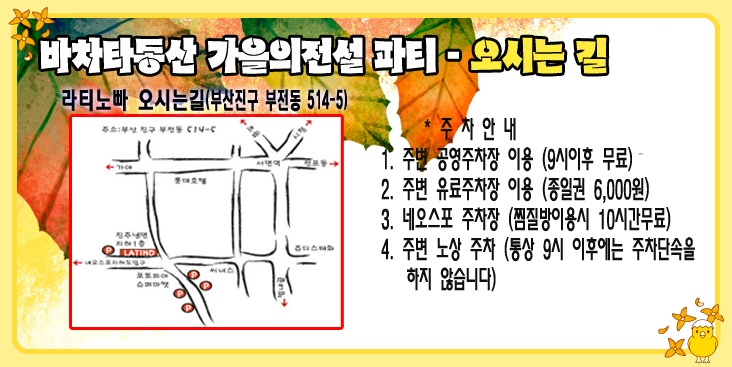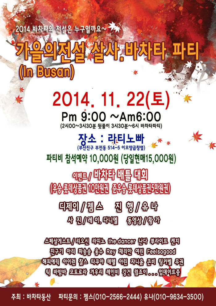 전국 분류 바동"가을의전설" 살사바차타파티(2014.11.22토) 작성자 정보 젬스쪽지보내기 메일보내기 자기소개 아이디로 검색 전체게시물쪽지보내기 메일보내기 자기소개 아이디로 검색 전체게시물 작성 작성일 2014.11.20 16:41 컨텐츠 정보 2,891 조회 0 추천 목록 답글 본문 예약 유의사항 1. 댓글로 참석예약만 해주시고 당일손입금(10,000원)하시면됩니다. 예약자200명한정 이후는 현매처리합니다 2. 전국살사,바차타관련동호회 시샵 및 인스트럭트는 무료입니다 (단, 신청글을 반드시 적어주세요) 초청을 원할경우 또는 초청 추천자가 있을경우 젬스&유나에게 연락주시면 처리해드리겠습니다 신청방법(댓글) 순번.닉네임 / 지역(동호회) / 남,여구분 / 한마디~~ // 0 추천 관련자료 링크 http://cafe.daum.net/_c21_/bbs_read?grpid=19pwa&mgrpid=&fldid=J4uU&content=P&contentval=000VXzzzzzzzzzzzzzzzzzzzzzzzzz&page=1&prev_page=0&firstbbsdepth=&lastbbsdepth=zzzzzzzzzzzzzzzzzzzzzzzzzzzzzz&listnum=20 512 회 연결 이전 11.29일 라플데이 미니파티~ 작성일 2014.11.20 16:55 다음 [해피 살사 라이프 연말 파티] 12월 28일!!! 유익하고 유쾌하고 다 퍼주는 행복한 파티. 개봉박두~~함께해요~ 작성일 2014.11.20 18:06 댓글 0 등록된 댓글이 없습니다. 로그인한 회원만 댓글 등록이 가능합니다. 목록 답글