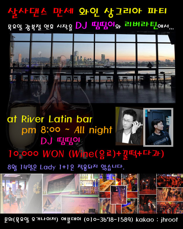 서울 분류 살사 만세 목요일 광복절 연휴 시작을 야경 좋은 리버라틴에서... 와인상그리아 파티 (All night Wine party) 작성자 정보 에블데이쪽지보내기 메일보내기 자기소개 아이디로 검색 전체게시물쪽지보내기 메일보내기 자기소개 아이디로 검색 전체게시물 작성 작성일 2014.08.11 16:10 컨텐츠 정보 5,436 조회 1 댓글 0 추천 목록 답글 본문 0 추천 관련자료 링크 http://cafe.daum.net/_c21_/bbs_read?grpid=19pwa&mgrpid=&fldid=J4uN&content=P&contentval=000adzzzzzzzzzzzzzzzzzzzzzzzzz&page=1&prev_page=0&firstbbsdepth=&lastbbsdepth=zzzzzzzzzzzzzzzzzzzzzzzzzzzzzz&listnum=20 391 회 연결 이전 8/15~16 광복절 전국 살사&바차타 파티-갈라빠&보니따&리버빠 작성일 2014.08.11 16:10 다음 ★8월15일 니르바나 & 썬 Romantic Summer Party~!!!@리버라틴 -특급감성 DJ소공녀-★ 작성일 2014.08.11 16:10 댓글 1 에블데이님의 댓글 에블데이쪽지보내기 메일보내기 자기소개 아이디로 검색 전체게시물쪽지보내기 메일보내기 자기소개 아이디로 검색 전체게시물 작성일 2014.08.11 16:10 8월 14일은 무료입장권 사용 불가 입니당. 오해 없으시길.. 그외 목요일은 기존 대로 Lady 1+1 day 유지 합니다. ^^ 8월 14일은 무료입장권 사용 불가 입니당. 오해 없으시길.. 그외 목요일은 기존 대로 Lady 1+1 day 유지 합니다. ^^ 로그인한 회원만 댓글 등록이 가능합니다. 목록 답글