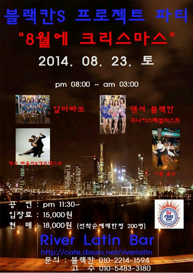 서울 분류 8월23일 블랙칸 프로젝트 파티 "8월에 크리스마스" 작성자 정보 블랙 칸쪽지보내기 메일보내기 자기소개 아이디로 검색 전체게시물쪽지보내기 메일보내기 자기소개 아이디로 검색 전체게시물 작성 작성일 2014.08.11 20:10 컨텐츠 정보 5,239 조회 0 추천 목록 답글 본문 8월23일 블랙칸 프로젝트 파트`8월에 크리스마스' 0 추천 관련자료 링크 http://cafe.daum.net/_c21_/bbs_read?grpid=19pwa&mgrpid=&fldid=J4uN&content=P&contentval=000agzzzzzzzzzzzzzzzzzzzzzzzzz&page=1&prev_page=0&firstbbsdepth=&lastbbsdepth=zzzzzzzzzzzzzzzzzzzzzzzzzzzzzz&listnum=20 272 회 연결 이전 **해피섬머 파티8,31(일)** `BATTLE` 에 초대합니다. BATTLE 공연, DJ BATTLE, 흥겨운 SALSA CRAZY (생맥주 무제한) 작성일 2014.08.11 20:10 다음 8/15~16 광복절 전국 살사&바차타 파티-갈라빠&보니따&리버빠 작성일 2014.08.11 16:10 댓글 0 등록된 댓글이 없습니다. 로그인한 회원만 댓글 등록이 가능합니다. 목록 답글