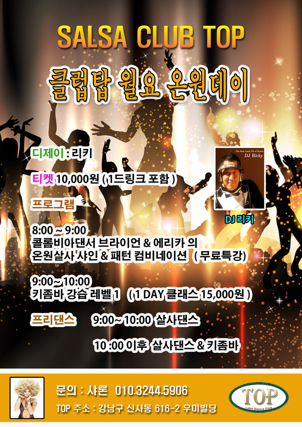 서울 분류 살사클럽TOP 월요 온원데이에 초대합니다~!! - 온원살사 무료특강 (콜롬비아댄서 에리카 & 브라이언) 작성자 정보 샤론쪽지보내기 메일보내기 자기소개 아이디로 검색 전체게시물쪽지보내기 메일보내기 자기소개 아이디로 검색 전체게시물 작성 작성일 2014.08.24 16:10 컨텐츠 정보 2,920 조회 0 추천 목록 답글 본문 브라인언과 에리카의 살사온원강습 동영상 매주 새로운 패턴 컴비네이션으로 수업이 진행됩니다... 0 추천 관련자료 링크 http://cafe.daum.net/_c21_/bbs_read?grpid=19pwa&mgrpid=&fldid=J4uN&content=P&contentval=000bEzzzzzzzzzzzzzzzzzzzzzzzzz&page=1&prev_page=0&firstbbsdepth=&lastbbsdepth=zzzzzzzzzzzzzzzzzzzzzzzzzzzzzz&listnum=20 243 회 연결 이전 **해피살사타운 섬머파티** 파티를 풍성하게 즐겨보아요. <상세 일정안내> 8월 31일(일요일)보니따 작성일 2014.08.25 00:10 다음 [압구정 탑바]9월27일 서울 바차타의 밤 행사에 초대 합니다 작성일 2014.08.22 20:10 댓글 0 등록된 댓글이 없습니다. 로그인한 회원만 댓글 등록이 가능합니다. 목록 답글