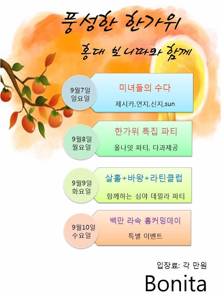 서울 분류 추석 맞이 홍대 보니따 특별 이벤트 (9월7일~9월10일) 작성자 정보 제시카.쪽지보내기 메일보내기 자기소개 아이디로 검색 전체게시물쪽지보내기 메일보내기 자기소개 아이디로 검색 전체게시물 작성 작성일 2014.08.28 04:10 컨텐츠 정보 3,049 조회 0 추천 목록 답글 본문 풍성한 한가위 홍대 보니따와 함께해요^ㅡ^ 사랑합니다 ^^ 0 추천 관련자료 링크 http://cafe.daum.net/_c21_/bbs_read?grpid=19pwa&mgrpid=&fldid=J4uN&content=P&contentval=000bTzzzzzzzzzzzzzzzzzzzzzzzzz&page=1&prev_page=0&firstbbsdepth=&lastbbsdepth=zzzzzzzzzzzzzzzzzzzzzzzzzzzzzz&listnum=20 232 회 연결 이전 무인도님 환영파티 @ 맘보 작성일 2014.08.28 09:35 다음 ★9월 5일(금요일)☆ 추석연휴 시작날 강턴 //아댄스 14주년파티//와 함께해용~♥ 작성일 2014.08.28 04:10 댓글 0 등록된 댓글이 없습니다. 로그인한 회원만 댓글 등록이 가능합니다. 목록 답글