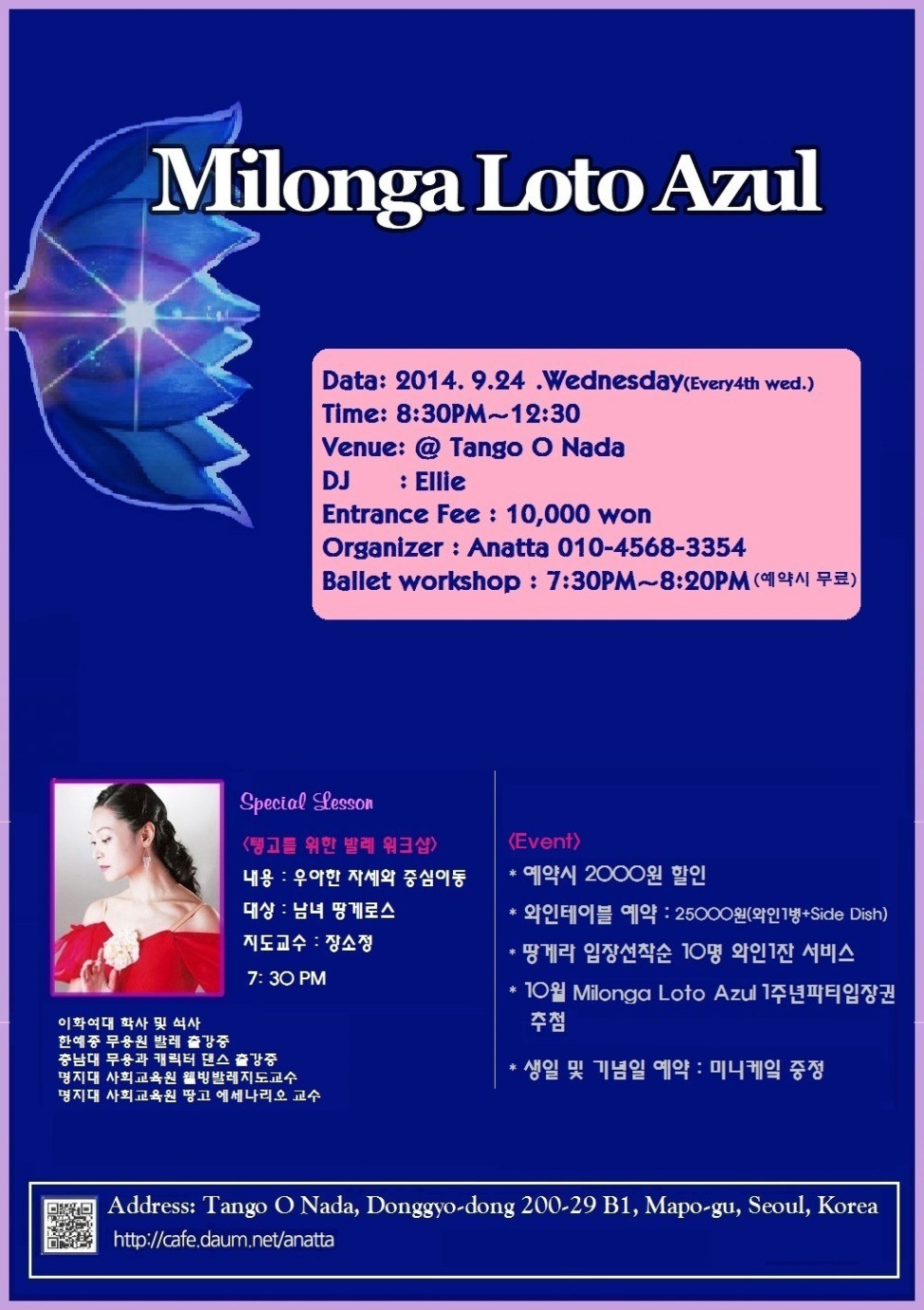 서울 분류 2014. 9. 24 Milonga Loto Azul @Tango O Nada(DJ: Ellie)/장소정 교수님 발레특강/10월22일 1주년파티신청 (DJ:아톰&비갠후)/(탱고공연: Genta&Anatta) 작성자 정보 아나타쪽지보내기 메일보내기 자기소개 아이디로 검색 전체게시물쪽지보내기 메일보내기 자기소개 아이디로 검색 전체게시물 작성 작성일 2014.09.01 19:14 컨텐츠 정보 3,501 조회 0 추천 목록 답글 본문 클릭하시면 신청서 양식이 보입니다~^^* 0 추천 관련자료 링크 http://cafe.daum.net/_c21_/bbs_read?grpid=19pwa&mgrpid=&fldid=J4uN&content=P&contentval=000bfzzzzzzzzzzzzzzzzzzzzzzzzz&page=1&prev_page=0&firstbbsdepth=&lastbbsdepth=zzzzzzzzzzzzzzzzzzzzzzzzzzzzzz&listnum=20 161 회 연결 이전 안녕하세요 나오미 입니다 9월3일~10월22일 매주 "수요일" 백호 &몽 "샤인 & 무브 7주 무료강습 있어요 작성일 2014.09.02 10:39 다음 9월4일 목요일은 리버파틴에서..(와인상그리아파티 안내) 작성일 2014.09.01 16:14 댓글 0 등록된 댓글이 없습니다. 로그인한 회원만 댓글 등록이 가능합니다. 목록 답글