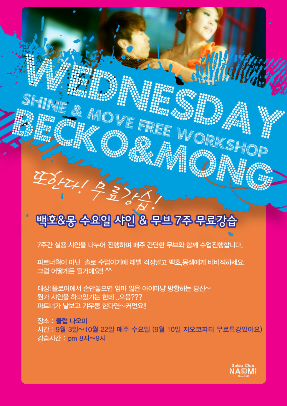 안녕하세요 나오미 입니다 9월3일~10월22일 매주 "수요일" 백호 &몽 "샤인 & 무브 7주 무료강습 있어요