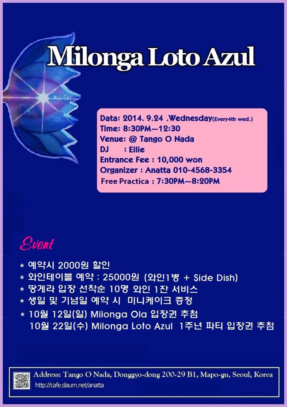 서울 분류 2014.9.24 Milonga Loto Azul @Tango O Nada(DJ: Ellie)땅게라 입장 선착순 와인서비스/10월22일 1주년파티신청(DJ:아톰&비갠후)/(탱고공연: Genta&Anatta) 작성자 정보 아나타쪽지보내기 메일보내기 자기소개 아이디로 검색 전체게시물쪽지보내기 메일보내기 자기소개 아이디로 검색 전체게시물 작성 작성일 2014.09.15 20:27 컨텐츠 정보 2,628 조회 0 추천 목록 답글 본문 클릭하시면 신청서 양식이 보입니다~^^* 0 추천 관련자료 링크 http://cafe.daum.net/_c21_/bbs_read?grpid=19pwa&mgrpid=&fldid=J4uN&content=P&contentval=000cPzzzzzzzzzzzzzzzzzzzzzzzzz&page=1&prev_page=0&firstbbsdepth=&lastbbsdepth=zzzzzzzzzzzzzzzzzzzzzzzzzzzzzz&listnum=20 252 회 연결 이전 [홍대보니따]10월6일(월) DJ소공녀 바차타 파티에 초대합니다.7시30분부터 개미&가치놀의 오픈강습 "사랑을 부르는 엘레강스 바차타" 작성일 2014.09.15 21:20 다음 드림살사 소셜파티 안내 작성일 2014.09.15 20:20 댓글 0 등록된 댓글이 없습니다. 로그인한 회원만 댓글 등록이 가능합니다. 목록 답글