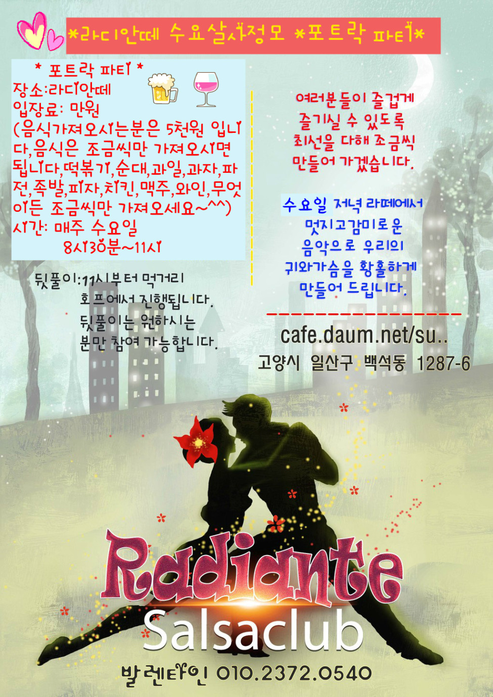 전국 분류 일산 살사&탱고 라디안떼 11월 26일 수요 살사정모(포트락 파티) 작성자 정보 발렌타인(일산 라디안떼)쪽지보내기 메일보내기 자기소개 아이디로 검색 전체게시물쪽지보내기 메일보내기 자기소개 아이디로 검색 전체게시물 작성 작성일 2014.11.25 00:22 컨텐츠 정보 2,987 조회 0 추천 목록 답글 본문 라디안떼 카페주소: http://cafe.daum.net/su.. 0 추천 관련자료 링크 http://cafe.daum.net/_c21_/bbs_read?grpid=19pwa&mgrpid=&fldid=J4uU&content=P&contentval=000Vhzzzzzzzzzzzzzzzzzzzzzzzzz&page=1&prev_page=0&firstbbsdepth=&lastbbsdepth=zzzzzzzzzzzzzzzzzzzzzzzzzzzzzz&listnum=20 526 회 연결 이전 ★☆★12/20(토)대구보니따"화이트 크리스마스빅파티"★☆★ 작성일 2014.11.25 08:57 다음 *2014 한국살사인의 밤* 12.06(토) 압구정 클럽TOP (해피살사타운,CSA,ZAOKO,라틴플로어댄스아카데미) 작성일 2014.11.25 00:40 댓글 0 등록된 댓글이 없습니다. 로그인한 회원만 댓글 등록이 가능합니다. 목록 답글