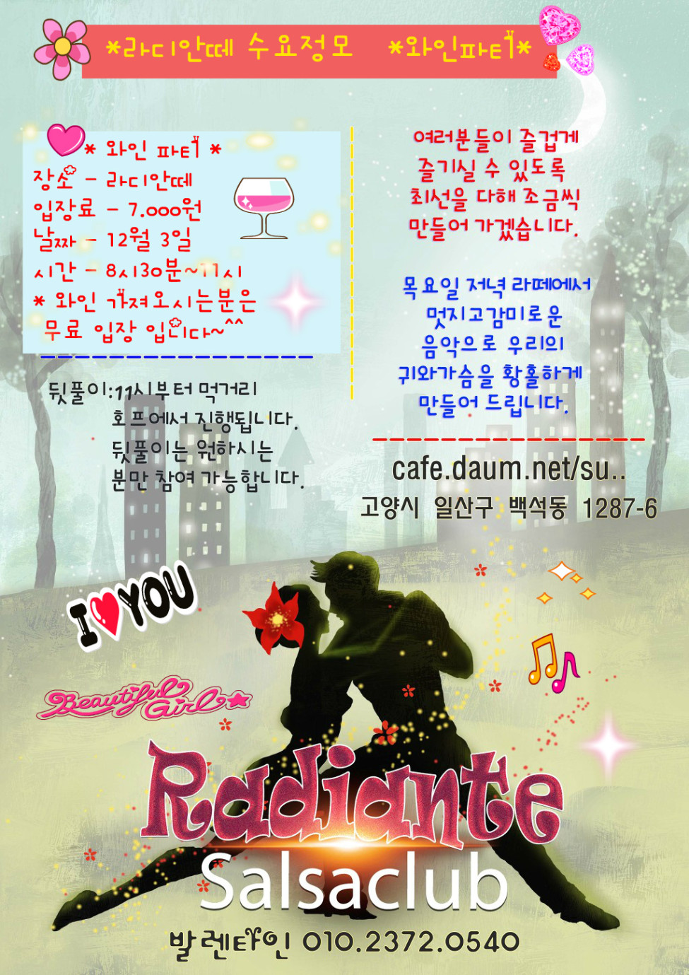 서울 분류 일산 살사&탱고 라디안떼 수요정모 < 와인파티 > 작성자 정보 발렌타인(일산 라디안떼)쪽지보내기 메일보내기 자기소개 아이디로 검색 전체게시물쪽지보내기 메일보내기 자기소개 아이디로 검색 전체게시물 작성 작성일 2014.12.02 02:23 컨텐츠 정보 2,500 조회 0 추천 목록 답글 본문 일산 살사&탱고 카페주소 http://cafe.daum.net/su.. 0 추천 관련자료 링크 http://cafe.daum.net/_c21_/bbs_read?grpid=19pwa&mgrpid=&fldid=J4uN&content=P&contentval=000g8zzzzzzzzzzzzzzzzzzzzzzzzz&page=1&prev_page=0&firstbbsdepth=&lastbbsdepth=zzzzzzzzzzzzzzzzzzzzzzzzzzzzzz&listnum=20 212 회 연결 이전 ☆☆ [12/6 오후 2시~] 제이댄스연말파티 ☆☆ 작성일 2014.12.02 13:20 다음 *2014 한국살사인의 밤* 12.06(토) 압구정 클럽TOP (해피살사타운,CSA,ZAOKO,라틴플로어댄스아카데미) 작성일 2014.12.01 22:50 댓글 0 등록된 댓글이 없습니다. 로그인한 회원만 댓글 등록이 가능합니다. 목록 답글