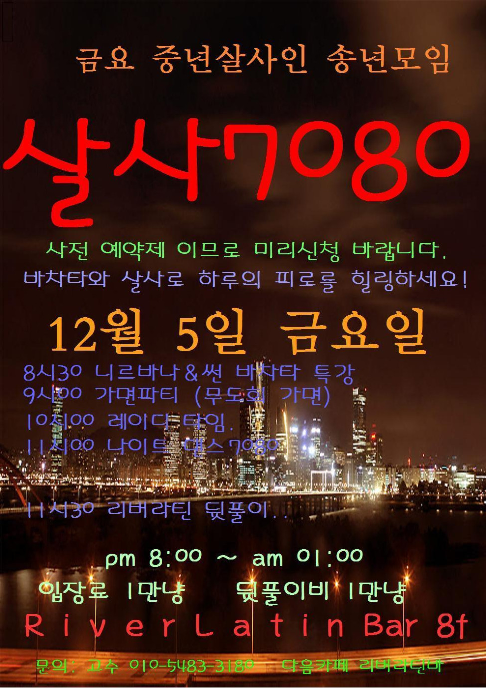 서울 분류 { 홍대 리버라틴바 } 12월 5일 금요일. 금요 중년살사인 살사7080 추억의 밤을~ 송년모임. 작성자 정보 리버고수 (서울)쪽지보내기 메일보내기 자기소개 아이디로 검색 전체게시물쪽지보내기 메일보내기 자기소개 아이디로 검색 전체게시물 작성 작성일 2014.12.03 17:11 컨텐츠 정보 4,006 조회 1 댓글 0 추천 목록 답글 본문 금요일밤은 리버라틴에서 금요 중년살사인 살사7080 추억의 밤을~ 0 추천 관련자료 링크 http://cafe.daum.net/_c21_/bbs_read?grpid=19pwa&mgrpid=&fldid=J4uN&content=P&contentval=000gKzzzzzzzzzzzzzzzzzzzzzzzzz&page=1&prev_page=0&firstbbsdepth=&lastbbsdepth=zzzzzzzzzzzzzzzzzzzzzzzzzzzzzz&listnum=20 232 회 연결 이전 제46회 DJ헤이즐&DJ린넨과 함께하는 Crazy Salsa(Crazy Monday) 파티에 여러분을 초대합니다.[12/8일 월요일][홍대 턴] 작성일 2014.12.03 22:46 다음 12월 18일 살사로 연말파티에 놀러오세요~♡ 작성일 2014.12.03 16:59 댓글 1 리버고수 (서울)님의 댓글 리버고수 (서울)쪽지보내기 메일보내기 자기소개 아이디로 검색 전체게시물쪽지보내기 메일보내기 자기소개 아이디로 검색 전체게시물 작성일 2014.12.03 17:11 100명한정 금요일 오후 2시까지 예약자만 입장 가능합니다. 리버라틴바 카페 공지게시판에 신청하세요~ 현재 82명 100명한정 금요일 오후 2시까지 예약자만 입장 가능합니다. 리버라틴바 카페 공지게시판에 신청하세요~ 현재 82명 로그인한 회원만 댓글 등록이 가능합니다. 목록 답글