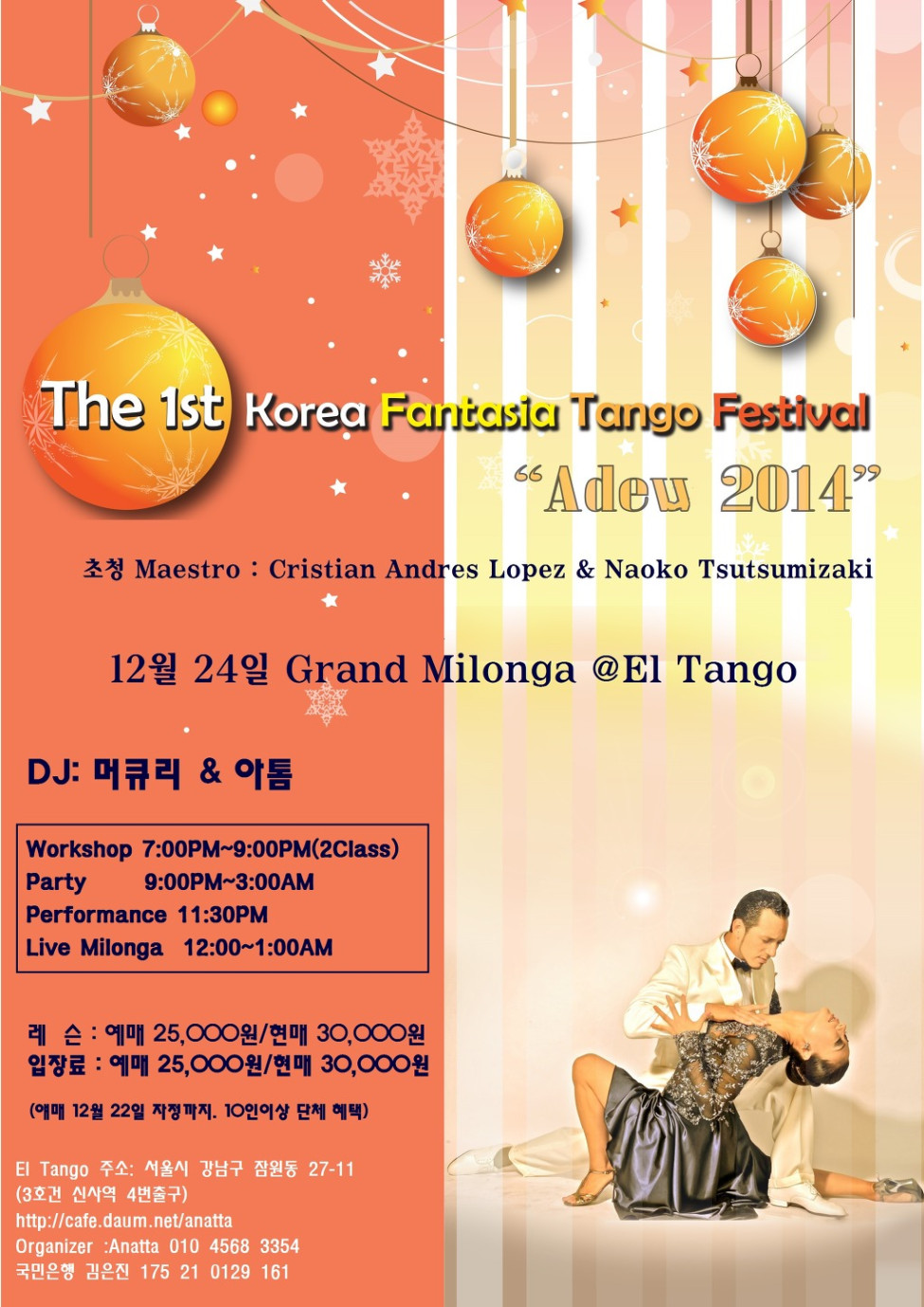 서울 분류 12월 24일, 수요일@엘땅고(제1회 코리아 환타지아탱고 페스티발)/Cristian&Naoko워크샵 & 공연/DJ:머큐리&아톰/예매할인22일자정까지 작성자 정보 아나타쪽지보내기 메일보내기 자기소개 아이디로 검색 전체게시물쪽지보내기 메일보내기 자기소개 아이디로 검색 전체게시물 작성 작성일 2014.12.22 12:37 컨텐츠 정보 2,634 조회 0 추천 목록 답글 본문 워크샵 상세내용보기 ---> http://cafe.daum.net/anatta/ppzG/1 0 추천 관련자료 링크 http://cafe.daum.net/_c21_/bbs_read?grpid=19pwa&mgrpid=&fldid=J4uN&content=P&contentval=000hYzzzzzzzzzzzzzzzzzzzzzzzzz&page=1&prev_page=0&firstbbsdepth=&lastbbsdepth=zzzzzzzzzzzzzzzzzzzzzzzzzzzzzz&listnum=20 237 회 연결 이전 2014.12. 25(목) 크리스마스 파티 & Thursday Party 작성일 2014.12.22 15:42 다음 12월 27일 대구바사모 연말파티 작성일 2014.12.22 09:27 댓글 0 등록된 댓글이 없습니다. 로그인한 회원만 댓글 등록이 가능합니다. 목록 답글