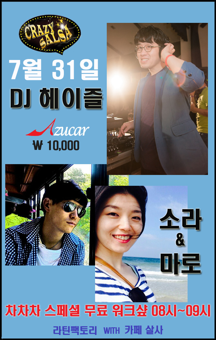 7월31일(일요일) DJ헤이즐과 함께하는 크레이지살사 in 대전 아수카 (8시~소라&마로 차차 워크샵)