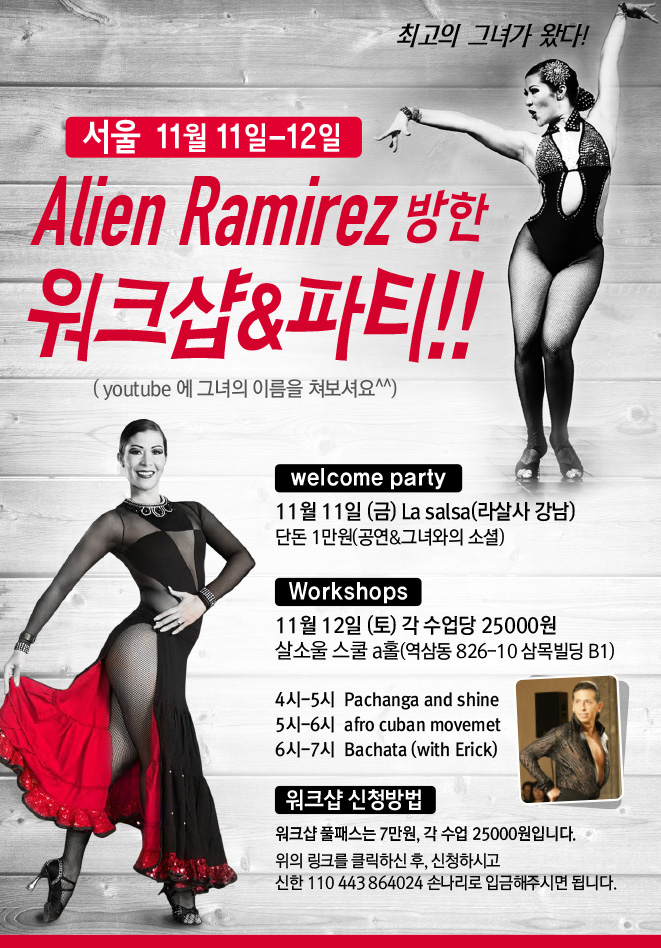 서울 분류 11월12일 금 라살사에서 세계 최고의 여성댄서 "알리엔 라미레즈"를 만나세요!!! 작성자 정보 손나리쪽지보내기 자기소개 아이디로 검색 전체게시물쪽지보내기 자기소개 아이디로 검색 전체게시물 작성 작성일 2016.10.05 22:13 컨텐츠 정보 3,673 조회 0 추천 목록 답글 본문 11월 12일 금욜 라살사에서 만나요!! 그날은 그녀를 만나러 출동!! https://www.youtube.com/watch?v=NkP6d0csYfM 0 추천 관련자료 링크 https://www.youtube.com/watch?v=NkP6d0csYfM 612 회 연결 이전 DJ 헤이즐과 함께하는 마콘도 자선 기부파티!! (10월7일 금요일) 작성일 2016.10.06 15:21 다음 10월 8일 토요일 스페셜 공연 작성일 2016.10.04 13:18 댓글 0 등록된 댓글이 없습니다. 로그인한 회원만 댓글 등록이 가능합니다. 목록 답글