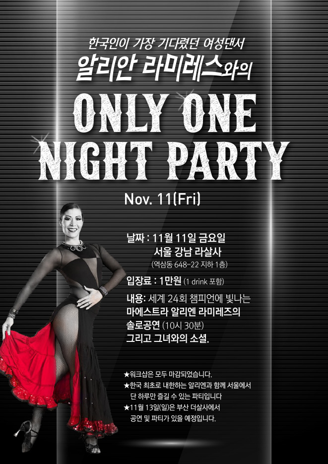 드디어 다음주 금요일 라살사!!!!! 한국 살사인들이 오랫동안 기다렸던 알리엔 라미레스와의 단 하루!!! 11월 11일 금요일 라살사에서 그녀의 공연과, 그녀와의 소셜을 절대로 놓치지 마셔요^^ 4시간만에 워크샵은 마감! 그녀를 서울에서 만날기회는 단 하루 담주 금욜입니다!! 10시 30분 공연 그리고 그 이후 소셜! 안오심 후회할듯!
