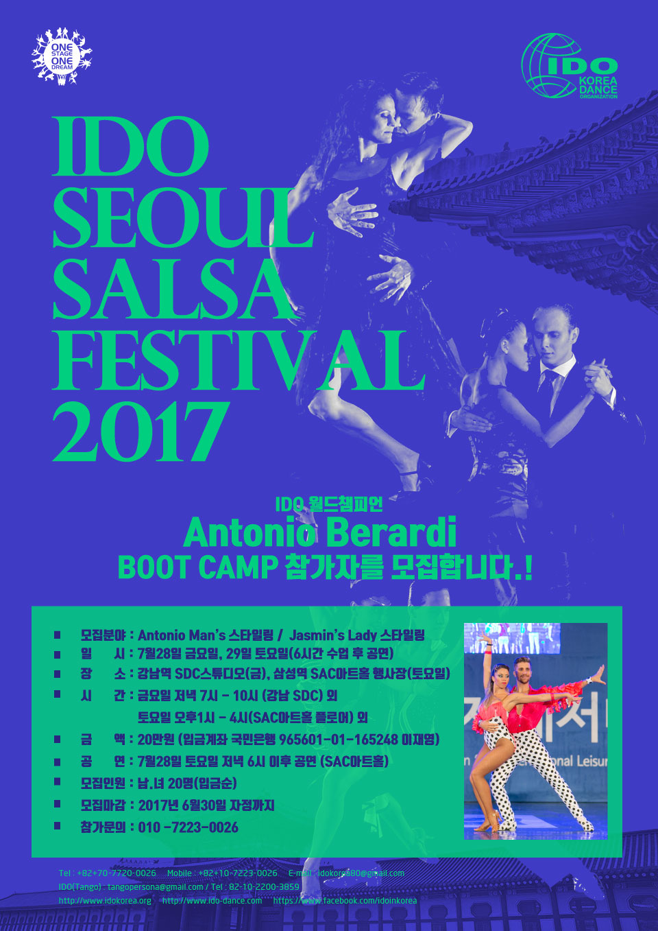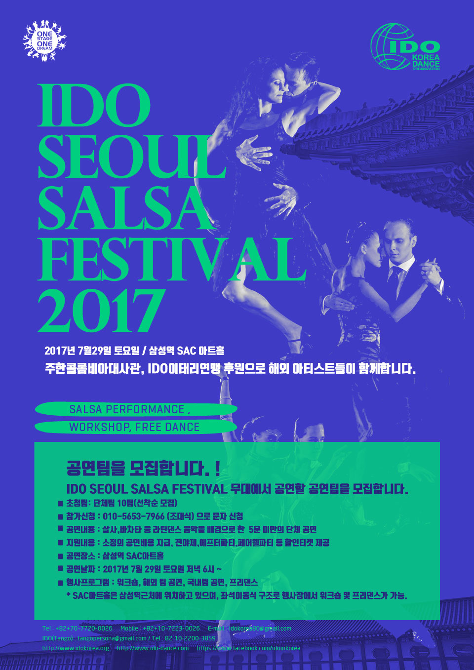 2017 IDO서울살사페스티벌과 함께할 공연팀을 모집합니다. IDO월드챔피언 Antonio & Jasmin과 함께 공연할 참가자도 모집합니다.
