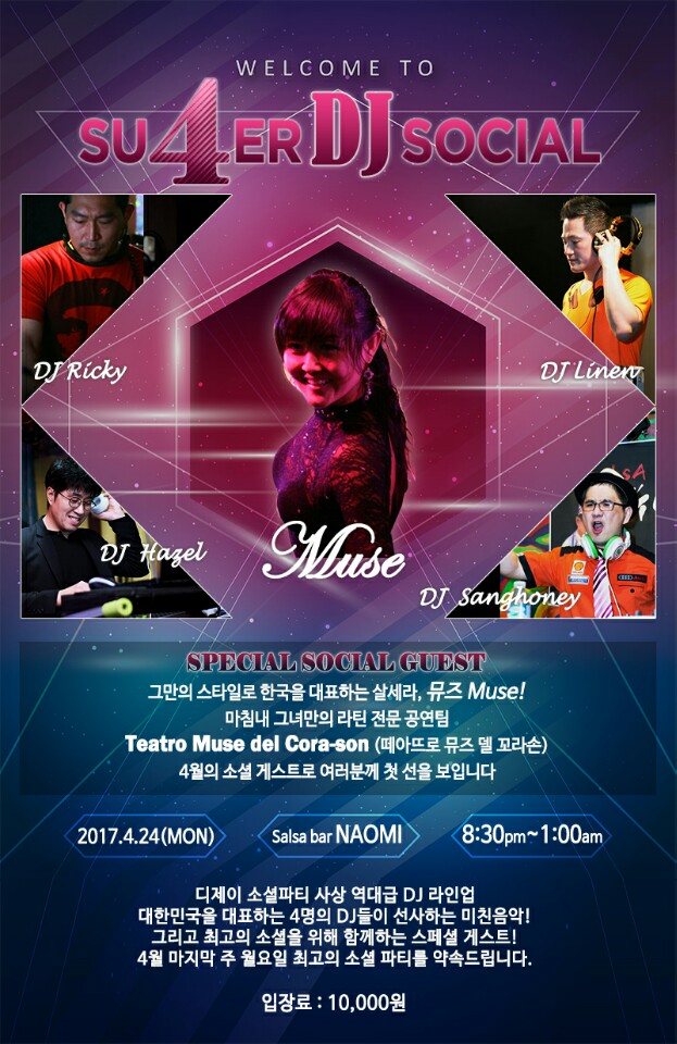 봄이 오는 4월의 [SU4ER DJ SOCIAL] Party 를 위해 플로어를 빛내 주실 특별 게스트로는 엘레강스한 스타일로 한국을 대표하는 아름다운 살세라, 뮤즈! 그녀가 이끄는 새로운 라틴전문공연팀인 Teatro Muse del Cora-son 떼아뜨로 뮤즈 델 꼬라손 이 함께 합니다!