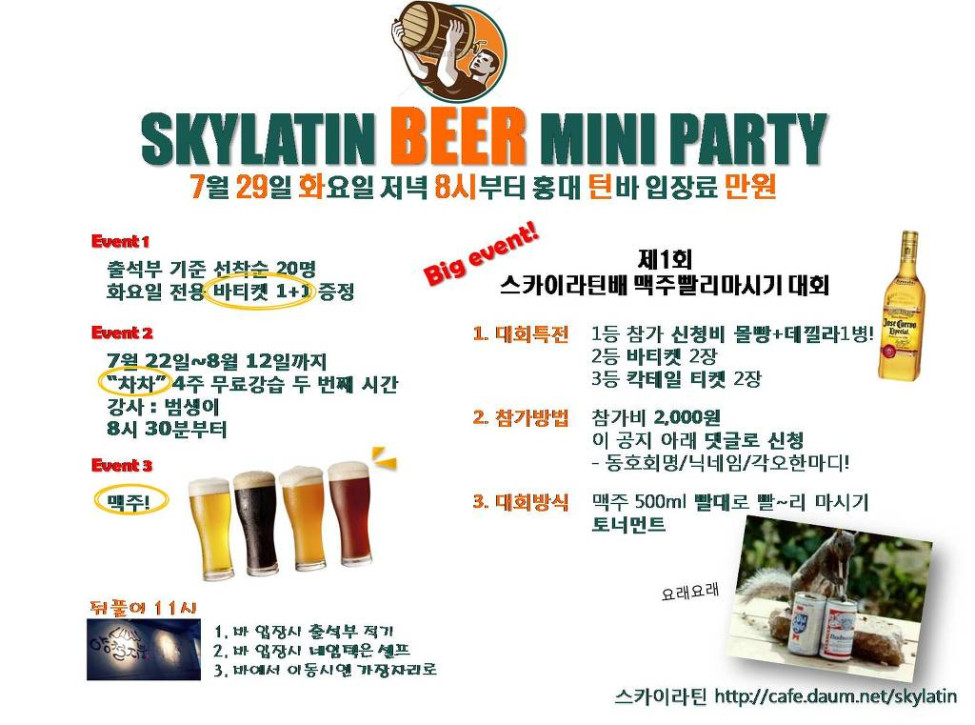 [홍대턴] 7월 29일 화요일 스카이라틴 맥주 미니파티에서 제1회 맥주 빨리마시기 대회를 개최합니다~ 많이 놀러오세요~♡