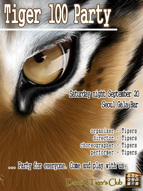 2014년 9월 20일 토요일 서울 갈라빠 기획, 안무, 공연자... 전부 호랑이들...... 前無後無 .... 이전에도 없었고, 앞으로도 없을.... 호랑이들이 준비하는 첫 파티..... 그래서 당신이 와야 하는 이유..... ..... 참석한다면 그대는~^^ 소셜고수로 가득한 호랑이들의 명성을 확인하고 즐기실 수 있습니다. |